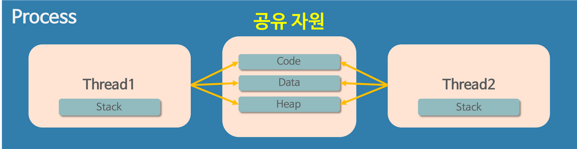 - 스레드는 stack을 제외한 공유자원(code, data, heap) 부분은 공유해 서로 읽고 쓸 수 있게 된다.