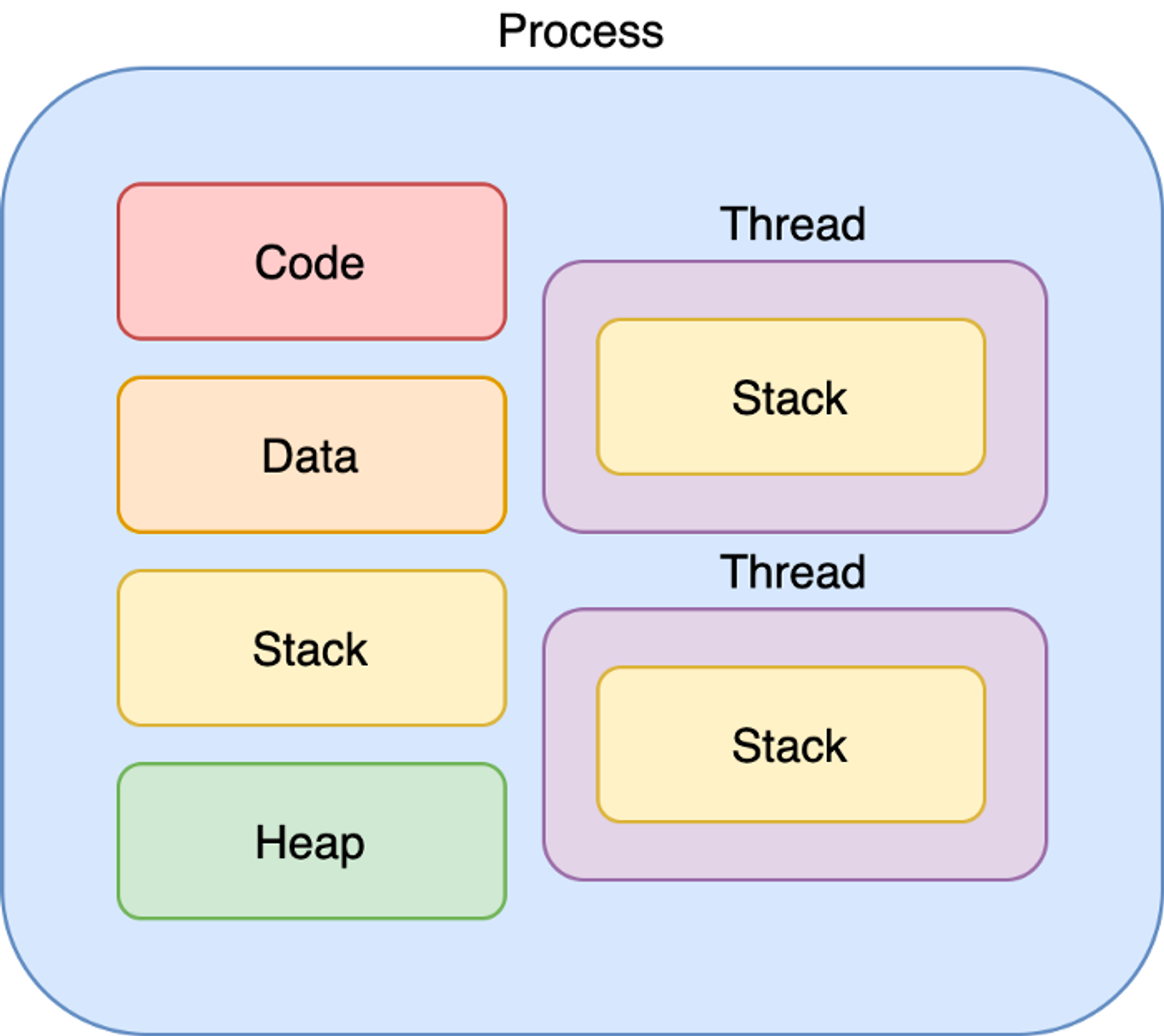- 프로세스는 최소 하나의 스레드를 보유하고 있으며, 각각 별도의 주소 공간을 독립적으로 할당 받는다. (code, heap, stack)